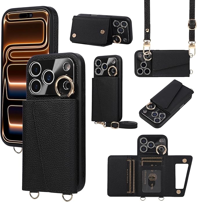 Pelanty 縄掛けケース For iPhone 17 Pro Max 手帳型ケース for iPhone17 Pro Max ケースリング 携帯カバー 肩掛け斜めがけショルダー ストラップ付き PUレザー+TPU アイフォン17プロ Max 背面カバー お札入れ小銭入れ 財布型ICカード収納 スタンド機能 ボタン磁気 耐衝撃 落下防止 ブラック