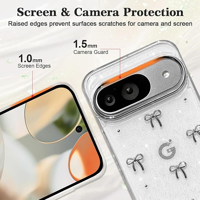 EYZUTAK ケース 対応 Google Pixel 9a 用の 保護ケースおしゃれ 可愛い 韓国 クリア りぼん立体感装飾 きらきら ラメ入り 透明TPU薄型 軽量 耐衝撃 擦り傷防止 保護カバー - 銀色のリボン