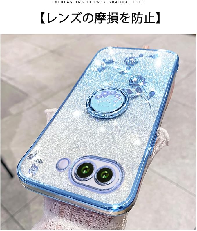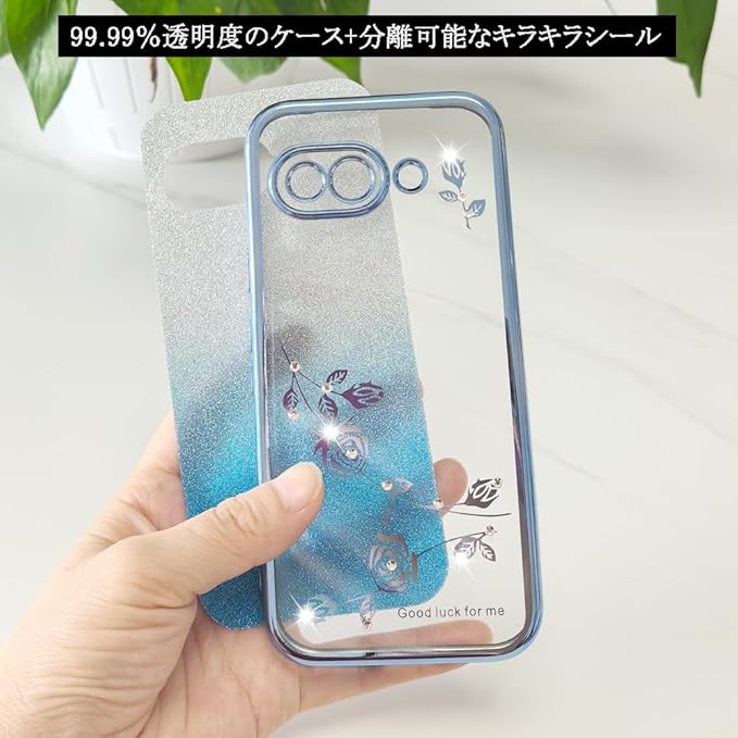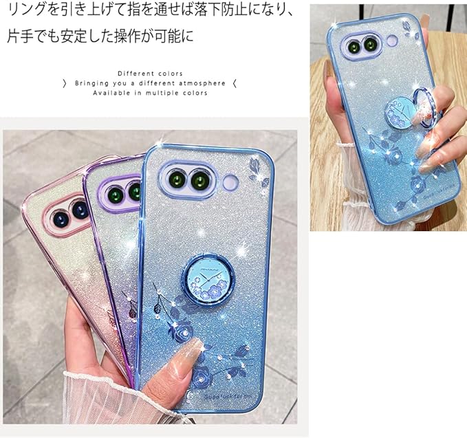 Google Pixel 9a 用 ケース リング付き クリア キラキラ メッキ加工 花柄 ソフトケース TPU 薄型 おしゃれ かわいい 衝撃吸収 ブランド グーグル ピクセル 9a カバー (ブルー, Pixel 9a)