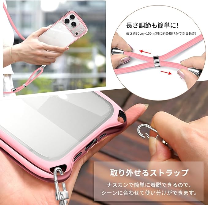 iPhone 17 Pro Max 用の ケース ショルダー ストラップ iPhone17ProMax 用の カバー クリア 肩掛け 斜めかけ 韓国 アイフォン17ProMax 用 透明 スマホケース (ローズゴールド)