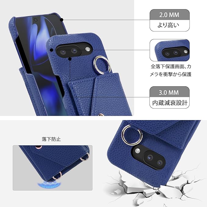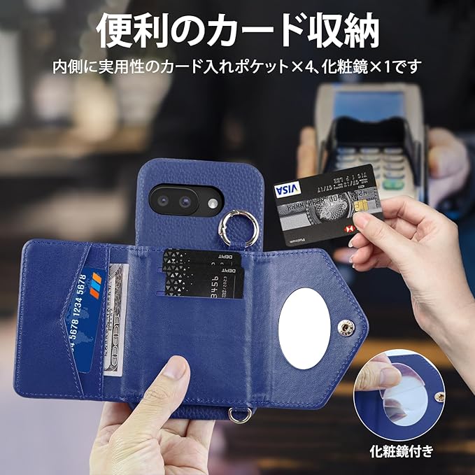 CASAFUNY Google Pixel 9a ケース 手帳型 ショルダー 調節可能なショルダーストラップ 首掛け 肩掛け 斜めがけ レディース 化粧鏡 カードケース ストラップ 携帯ケース グーグル ピクセル9a ケースカード収納 縦置き 横置き スタンド 耐衝撃 肌感PUレザー シンプル スマホケース 軽量 携帯カバー(6.3インチ)ブルー