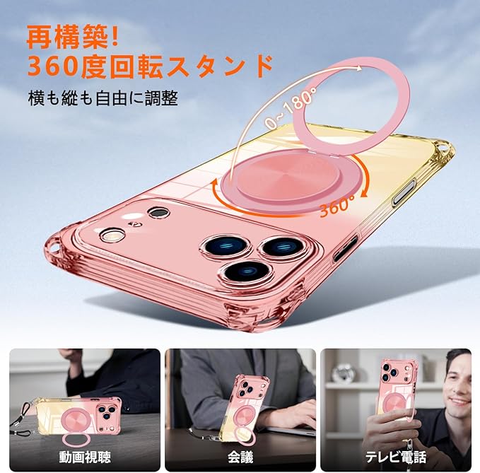 iphone 17Pro ケース クリア magsafe対応対応 リング ストラップ 360度回転 落下防止 アイフォン 17 pro 耐衝撃 アンカー構造 携帯ケース マグセーフ リング付き ショルダーストラップ 肩掛け いphone 17 プロ カバー 透明 カメラ保護 おしゃれ 純正 グラデーション