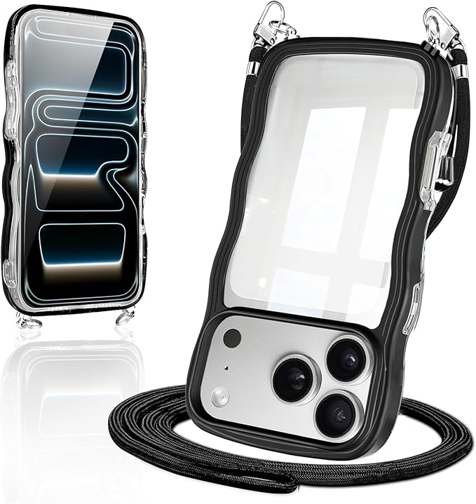 iPhone 17 Pro Max 用の ケース ショルダー クリア うねうね いphone17 pro max カバー スマホケース 創意 個性 肩掛け 首掛け 斜めかけケース 可愛い かわいい 韓国 透明 TPU 耐衝撃 アイフォン17promax(ブラック)
