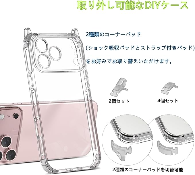 【自分だけのオリジナルケースにカスタマイズ】 4つの角パーツを自由に交換できるDIY設計。衝撃吸収に優れた「エアバッグコーナー」と、携帯に便利な「ストラップコーナー」をお好みで組み合わせ。1つのケースで、防仕様と持ち運び便利な仕様を簡単に切り替えられます。