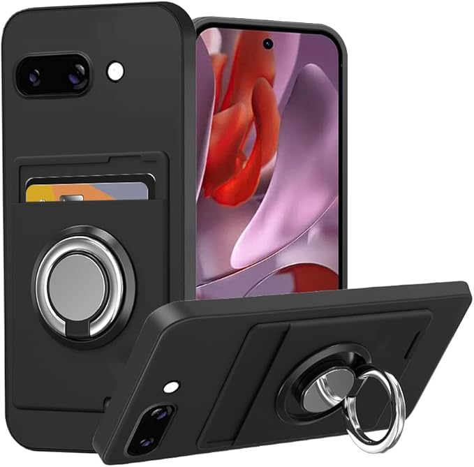 対応 Google Pixel 9a ケース リング付き シリコン カード収納 ピクセル9a スマホカバー スタンド機能 360 回転リング 耐衝撃 滑り止め 黑