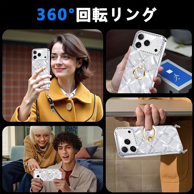 ケース iPhone 17 Pro Max クリア 用の 薄型 ひし形 ダイヤモンド ぴかぴか光る クリア いphone 17pro maxカバー 軽量 TPU ファッション アイフォン17 pro max スマホケース 首かけ 斜めがけ 調節可能 リング付き 360 回転 スタンド機能 耐衝撃 転倒防止 かんしょうほご 耐久性 黄変防止 ひっかき防止 レンズ保護スマホ (透明)