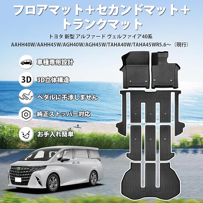 【適合車種】トヨタ 新型 アルファード ヴェルファイア40系 AAHH40W/AAHH45W/AGH40W/AGH45W/TAHA40W/TAHA45W [ガソリン/ハイブリッド共通] 年式:R5.6~(現行)※Xグレード車を除く※【セット内容】フロアマット 2P、2列目用フロアマット 1P、3列目用フロアマット 3P、ラゲッジマット 1P 合計7枚セット※購入する前、形状、年式とモデルを確認してください。