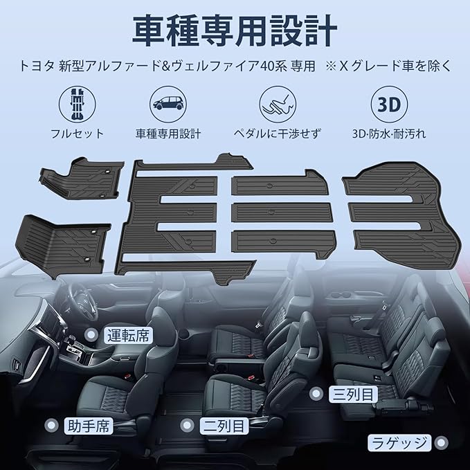 1.【適合車種&完全対応】トヨタ 新型 アルファード ヴェルファイア40系 カーマット。AAHH40W/AAHH45W/AGH40W/AGH45W/TAHA40W/TAHA45W [ガソリン/ハイブリッド共通] 年式:R5.6~(現行)。ご注意:※Xグレード車を除く!セット内容:フロアマット 2Pcs、セカンドマット 1Pcs、ステップマット 3Pcs、ラゲッジマット 1Pcs(合計7点セット)。※ご購入前に画像にて形状、車種と年式を再確認してください