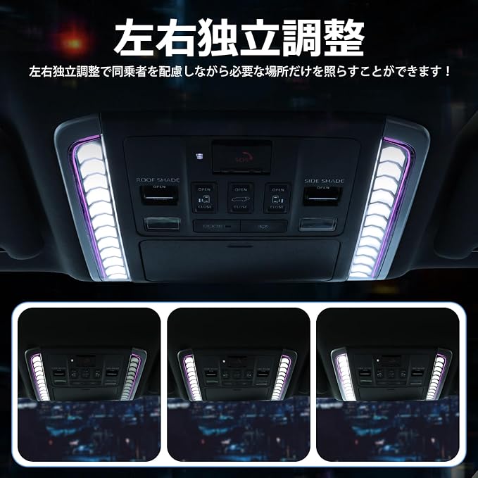 4.【タッチセンサ一&左右独立調整】:タッチセンサ一が搭載されて、ランプの中央周りをタッチすることで、明るさ調整とOFF操作ができます。左右独立調整で同乗者を配慮しながら必要な場所だけを照らすことができます!