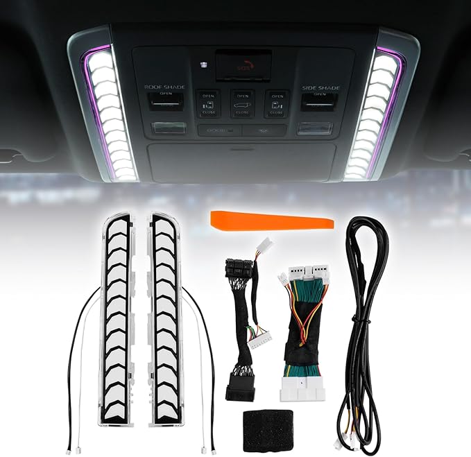 1.【適合車種】:アルファード ヴェルファイア 40系。適合型式:AAHH AGH TAHA 40 45。適合年份:2023年6月~現行。※アルファード40系 Xグレードは装着不可です。※切り替えはエンジン始動時のみ可能です。※エンジンOFF時にドア開閉するとイルミネーションは15秒間の一時点灯状態になります。15秒以内にエンジンONするとイルミネーションは点灯状態が維持され、15秒後にエンジンONするとイルミネーションは消灯状態が維持されます。注意事項:製品画像とお車をご確認頂き、お買い求め下さい。【セット内容】:フロントルームランプキット*2+配線一式+内張りはがし*1