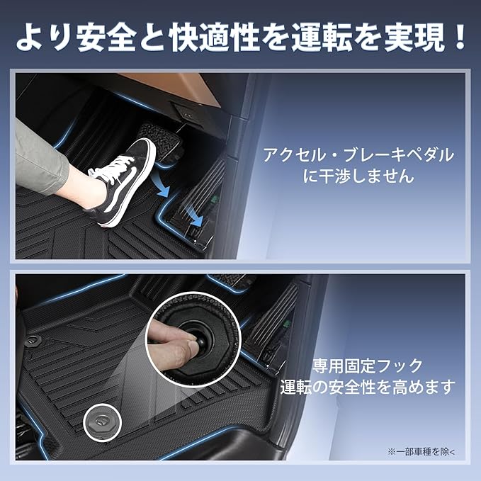 5.【専用設計留め具】:専用設計留め具付き、フロアマットを固定し、運転の安全性を高める!脱着も簡単にできるし、ネジや両面テープなどは要らない取付を採用、到着したすぐに取付できます。※注意事項※:製品包装が折りたたみ式で梱包されているため、到着後にお湯やドライヤーなどで暖めれば元の状態に戻ります。