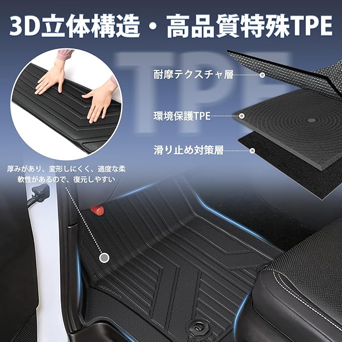 2.【高品質TPE素材】:摩擦性に優れたTPE樹脂素材を採用し、耐汚れと耐摩擦性を実現しました。3D立体構造のお掛けで車が運転している途中でも、飲み物などが溢れっても水やジュースなどはフロアマットの外への侵入を防止します。弊社のマットには防水性&耐摩擦性に優れた、変な匂いも無し、お手入れも楽々!