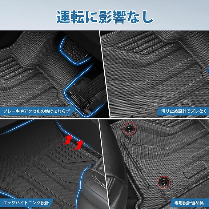 4.【車種専用設計・取付簡単】丁寧に寸法をとった完全車種専用設計なので、アクセルペダルとブレーキペダルには干渉いたしません。 留め具裏側にズレ防止加工済み、マットをしっかりと固定し、運転の安全性を高めます。ネジや両面テープを使わずに、簡単に装着と脱着ができ、到着したすぐに取付できます。初心者や女性の方でもお手軽に取り付けます。