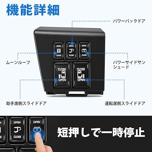 【5ボダン&多機能】アルファード ドライバーの「こんな機能が手元にあれば」をカタチにしました。 手元でらくらく一括操作が可能に増設スイッチには、日常的によく使う以下の5つの機能をまとめて搭載。①ムーンルーフの開閉 ②パワーバックドアの操作 ③パワーサイドサンシェードの開閉 ④助手席側/運転席側のスライドドアの個別開閉 ⑤短押しで各動作の一時停止。 ドア開閉スイッチで、毎日の車内操作がより直感的で快適に。頻繁に使う機能だからこそ、ワンタッチでスマートに操作できる快適さをぜひ体感してください。