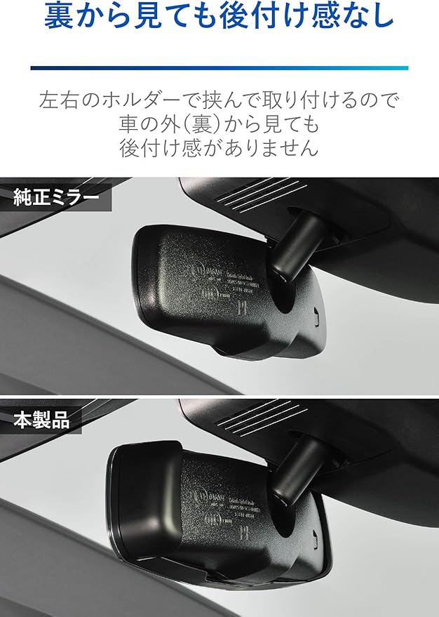 左右のホルダーで挟んで取り付けるので車の外(裏)から見ても後付け感がありません。