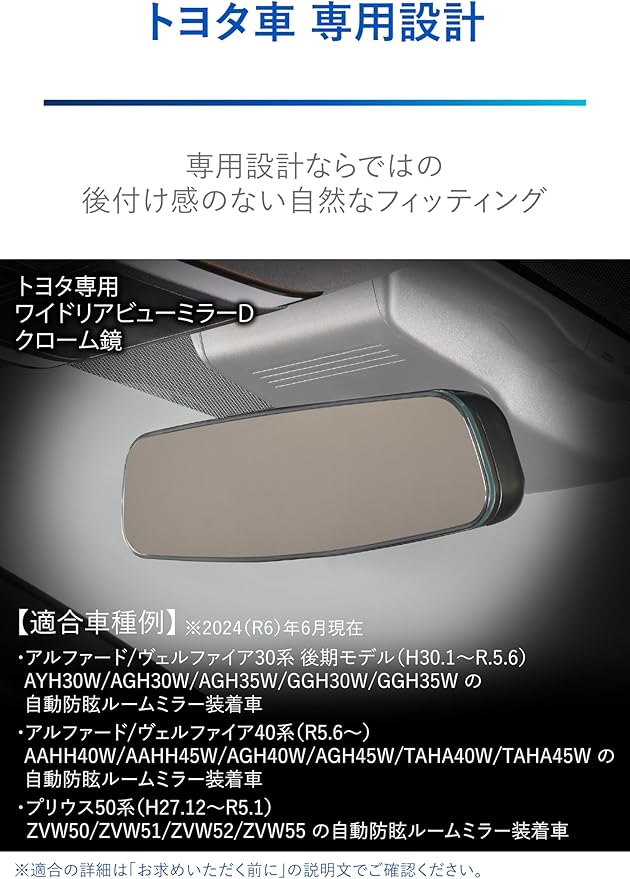 【トヨタ車 専用設計のワイドリアビューミラー Dタイプ クローム鏡】 専用設計ならではの後付け感のない自然なフィッテイングを実現したワイドルームミラー。 【適合車種例】 2024(R6)年6月現在 ・アルファード/ヴェルファイア30系 後期モデル(H30.1~R.5.6) AYH30W/AGH30W/AGH35W/GGH30W/GGH35W の自動防眩ルームミラー装着車 ・アルファード/ヴェルファイア40系(R5.6~) AAHH40W/AAHH45W/AGH40W/AGH45W/TAHA40W/TAHA45W の自動防眩ルームミラー装着車 ・プリウス50系(H27.12~R5.1) ZVW50/ZVW51/ZVW52/ZVW55 の自動防眩ルームミラー装着車 ・C-HR 年式 H28.12~R5.8 型式 ZYX10/ZYX11/NGX10/NGX50 の自動防眩ミラー装着車 ※上記車種以外の適合確認方法は『お求めいただく前に』をご覧ください。