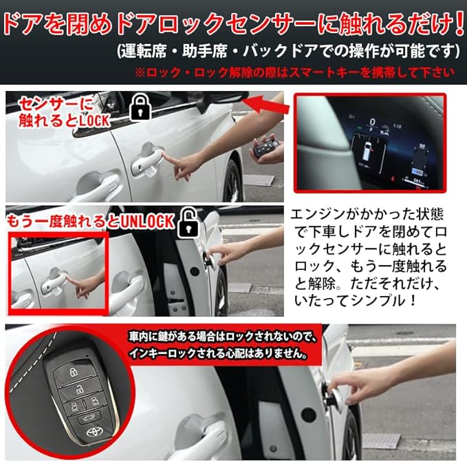 【注意事項】 ※必ずシフトを『P』に入れた状態でロックして下さい。 ※車内に人が残っている状態で車外からドアをロックした場合、車内からのロック解錠が可能です。また盗難防止機能もありません。ドアを開けてもエンジンが停止せず、アラーム等も鳴りません。お子様などを車内に残される場合など、お車を目の届かない場所に停めた状態や、長時間エンジンを掛けたままの状態でドアロック機能を使用しないようご注意下さい。 ※こちらの商品は車検非対応になります、車検時は機能切替を行ってください。