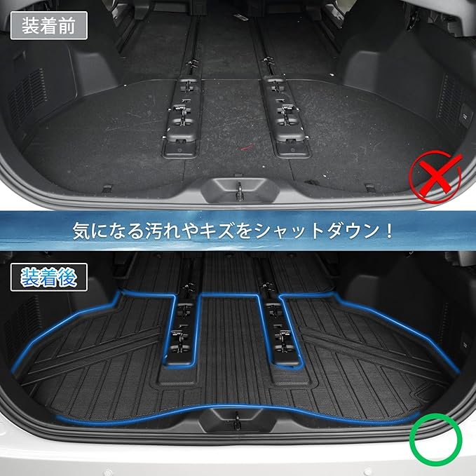 5.【簡単取付】車種専用設計なので、隙間なく装着し、純正品並みのフィット感を手に入れます!取付は純正マットを取り外し、そのままトランクに敷くだけです。女性1人でも簡単に装着できます。「※ご注意:配送サイズ規定の関係で商品を折りたたんだ状態で発送いたします。商品到着直後は折り目残ることもございますが、弾性の高い素材ですので時間たって元の状態に戻ります。予めご了承ください。※コツ:ヘアドライヤーを使えばより元の状態に戻りやすいです。※」