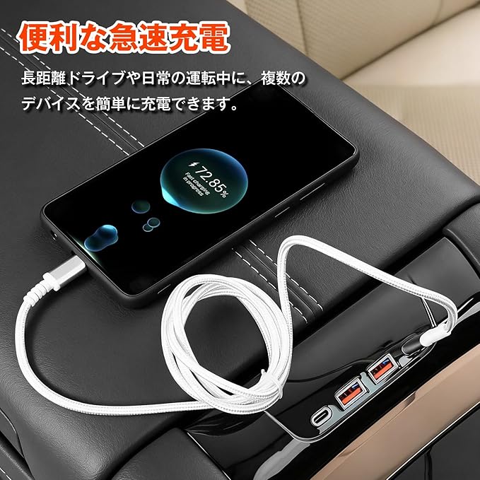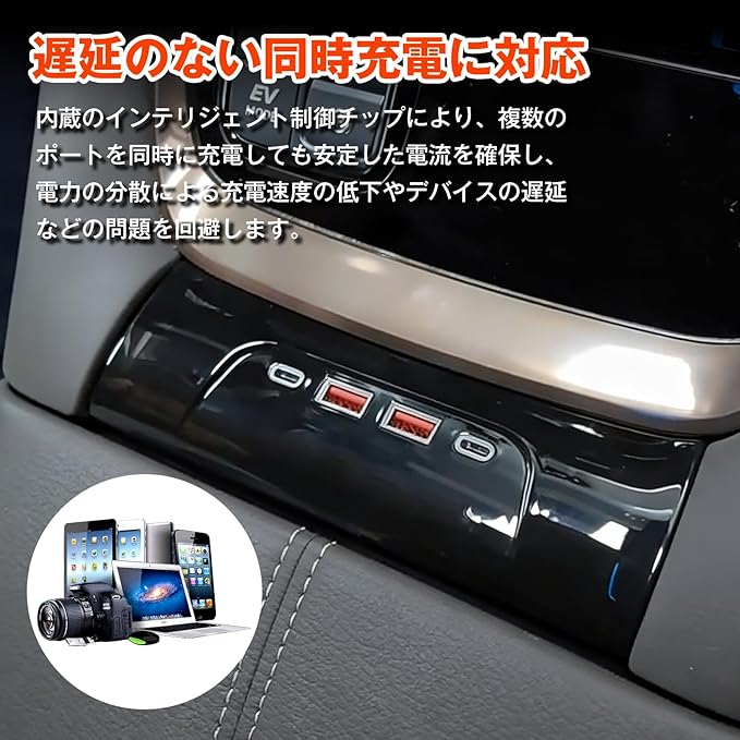 デュアルインターフェースの組み合わせで複数デバイス接続に対応:デュアルインターフェースの組み合わせでマルチデバイス接続:各ポートはType-Aポート2つとType-Cポート2つに拡張可能。異なるインターフェースを持つ電子機器に完璧に適応します。これにより、従来の車載カメラのインターフェースが限られていたり、単一インターフェースしか搭載されていなかったりする問題を容易に解決し、複数の旅行者のマルチデバイス接続ニーズを満たします。