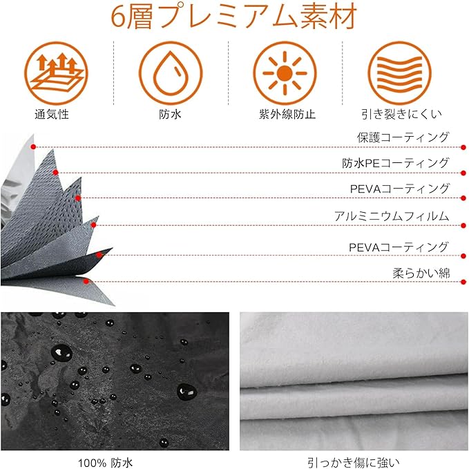 【高品質裏起毛タイプ】多層構造とダブルステッチで丁寧に手作りされています。生地の表面には水を弾く撥水加工を施し、さらに断熱効果のあるコーティング仕様を施しています。通気性がありながら水を通さず、湿気の侵入を防ぎます。裏生地は厚く起毛されており、いたずらや衝撃などダメージを軽減でき、強風時に車体に擦れても塗装を傷める心配がありません。