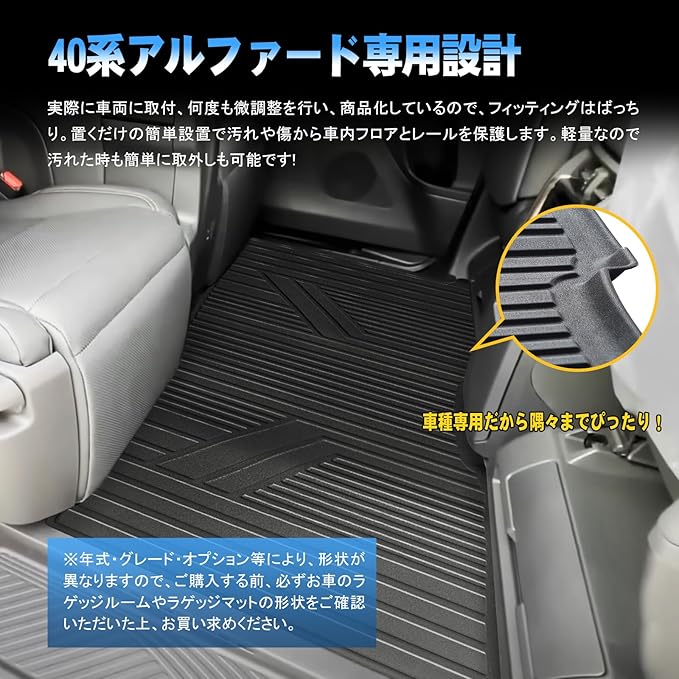 【適合車種】アルファード/ヴェルファイア40系全グレード。適合グレード:全グレード。適合型式:7人乗ガソリン車/ハイブリッド車 AAHH40W/AAHH45W/AGH40W/AGH45W/TAHA40W/TAHA45W。適合年式:令和5年6月~現行※年式・グレード・オプションなどにより適合しない場合がございます。形状を確認の上、お買い求めください。