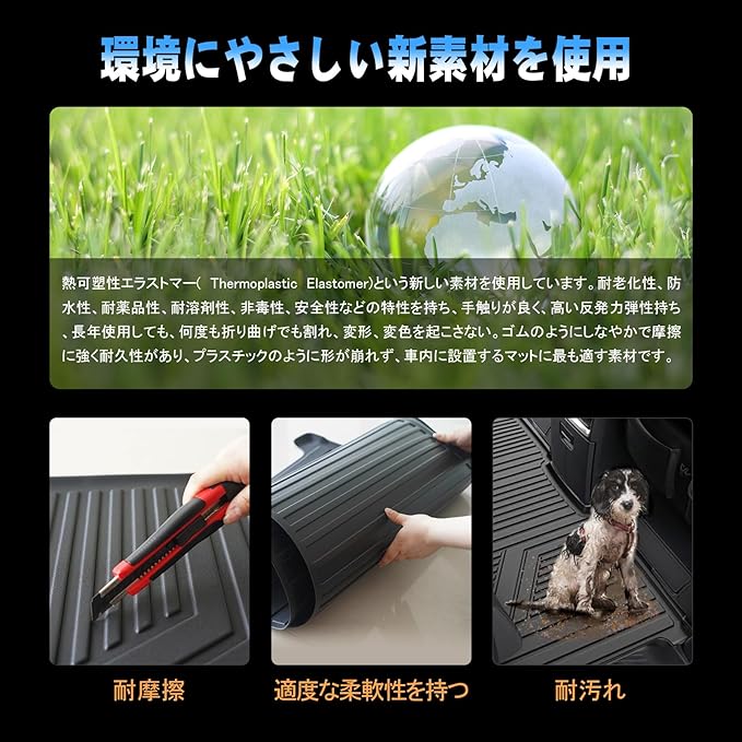 【環境にやさしい新素材を使用】TPEという新しい素材を使用しています。耐老化性、防水性、耐薬品性、耐溶剤性、非毒性、安全性などの特性を持ち、手触りが良く、高い反発力弾性持ち、長年使用しても、何度も折り曲げでも割れ、変形、変色を起こさない。ゴムのようにしなやかで摩擦に強く耐久性があり、プラスチックのように形が崩れず、車内に設置するマットに最も適す素材です。