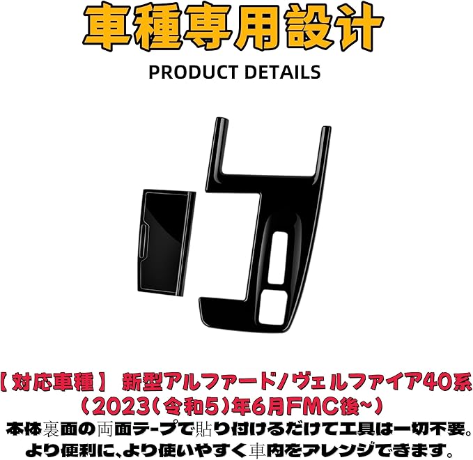 本品は、2023年6月以降に生産されたアルファード ヴェルファイア 40系専用に設計された商品です。環境に優しいABS素材を使用し、安全で無毒、耐熱性・耐寒性に優れ、防水・絶縁性も備えており、長期間ご使用いただけます。実車のデータに基づいて設計されているため、元のカップホルダーに完璧にフィットし、既存の機能を妨げることなく、車内の質感を向上させます。取り付けは簡単で、工具不要で、取り付け面を清掃し、裏面の両面テープを剥がすだけでしっかり固定可能。シンプルで洗練されたデザインと高品質な仕上げが高級感を演出し、車内のインテリアと調和して、車全体の格調を高めます。