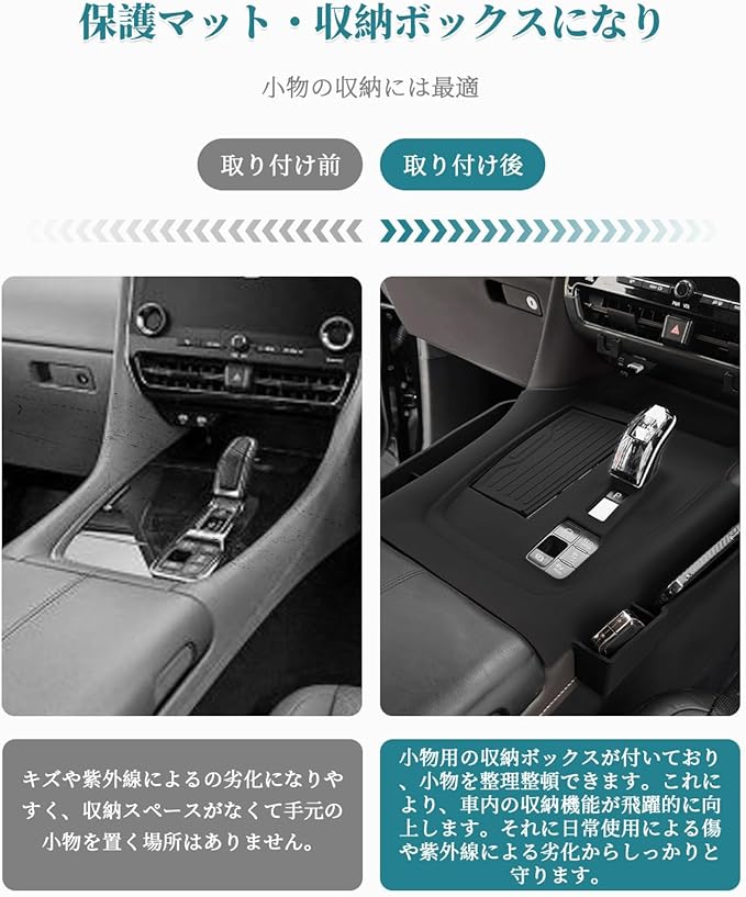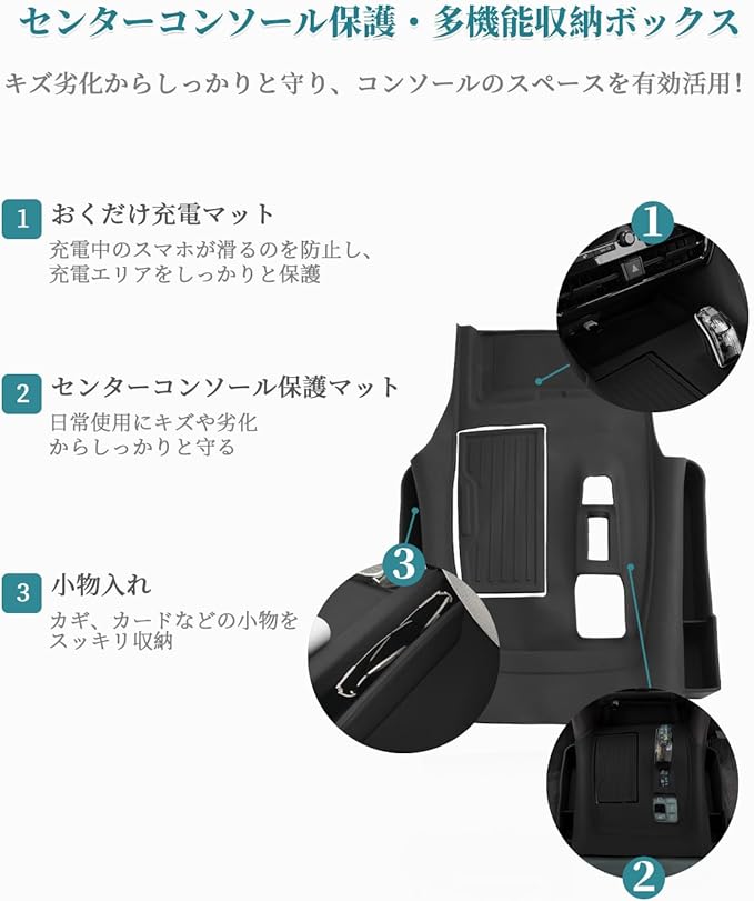 【増設収納トレイ・コンソール保護】アルファード40系にぴったりのセンターコンソールトレイで、センターコンソールのスペースを有効活用し、スマホ、かぎ、カードなどの小物を一時的に置く場合に最適です。さらに、柔らかいノンスリップマットが滑り止めでセンターコンソールエリアをしっかりと保護し、キズや紫外線によるの老化を防ぎます。非常に実用的なカーアクセサリーです。