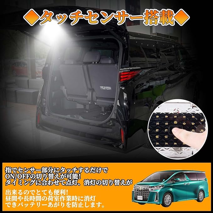 【ワンタッチタッチスクリーン】ヴェルファイア40系 増設ラゲッジランプは中央部分にスイッチボタンを搭載しており、スイッチを軽くタッチするだけでON/OFFを切り替えることができます。スイッチボタンは白い光が発光さており、直感的でストレスフリーな操作性が特徴で、特に夜間でも簡単に点灯できます。