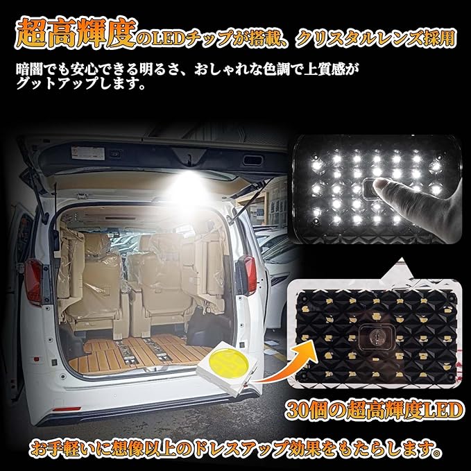 【高輝度】POPMOTORZ 40系ラゲッジランプ は、超高輝度の30個LEDチップが搭載し、広範囲を明るく照らし、荷室オープン時の夜間視認性を大幅に向上します!お釣りやキャンプ、夜間作業などに合わせて、簡単に最適な光量に調節することができます。