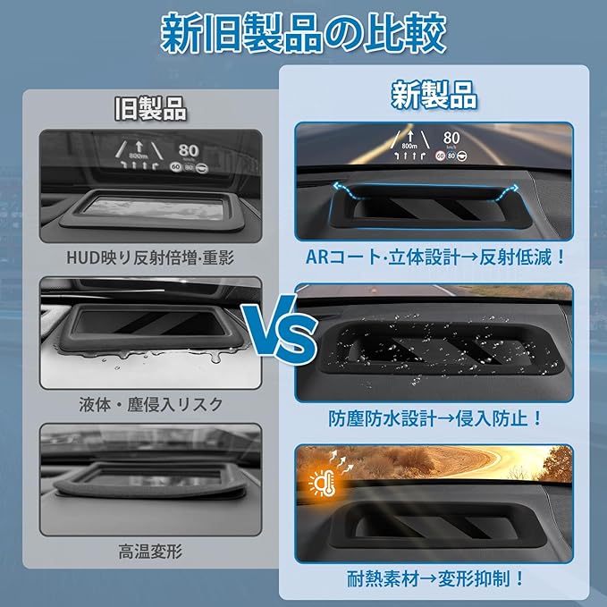 3.【耐高温ABS樹脂・防塵防水設計】:本製品のフレームは耐高温ABS樹脂を採用しており、優れた耐久性で長時間の使用にも耐えます。さらに表面には艶消し塗装を施しているため、フロントガラスへの反射を大幅に低減。完全防塵・防水設計により、水の侵入やホコリの付着を防ぎ、画面の視認性を維持します。汚れても、簡単に拭き取れるのでメンテナンスも楽々です。