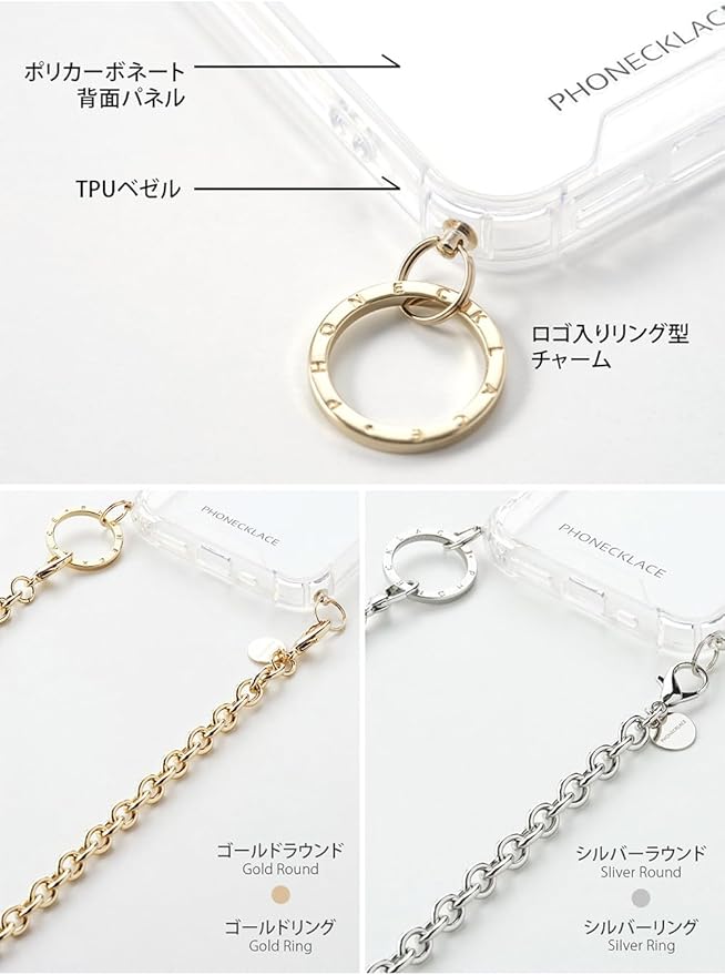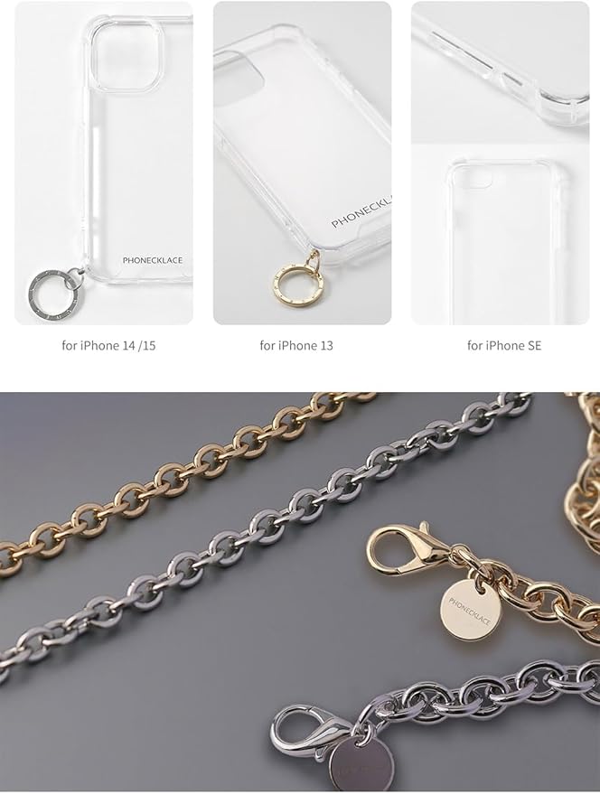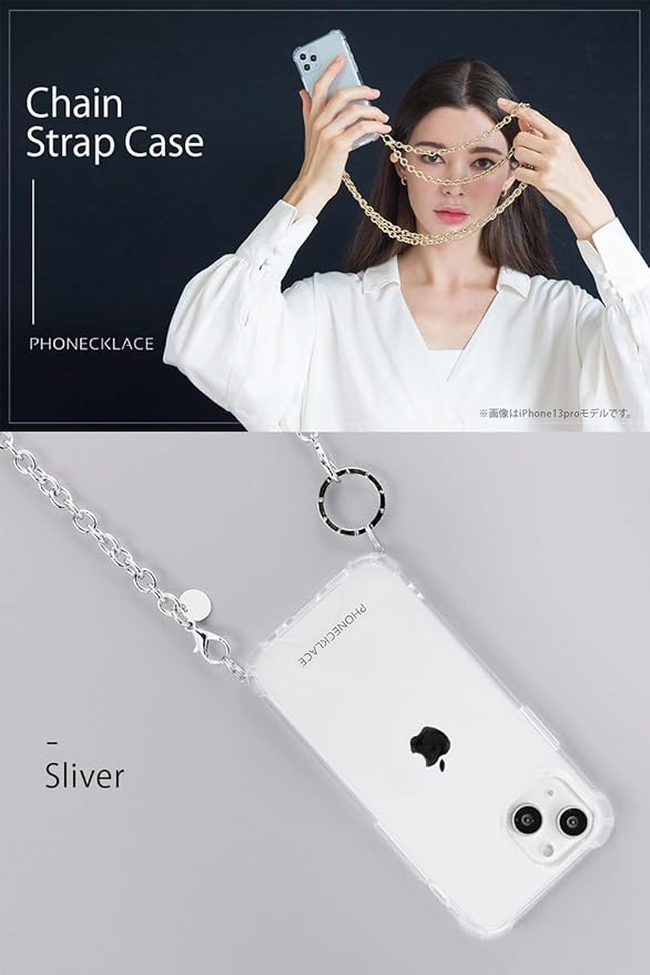 PHONECKLACE「チェーンショルダーストラップ付きクリアケース」は、肩や首からiPhoneをかけることができるクロスボディケースです。