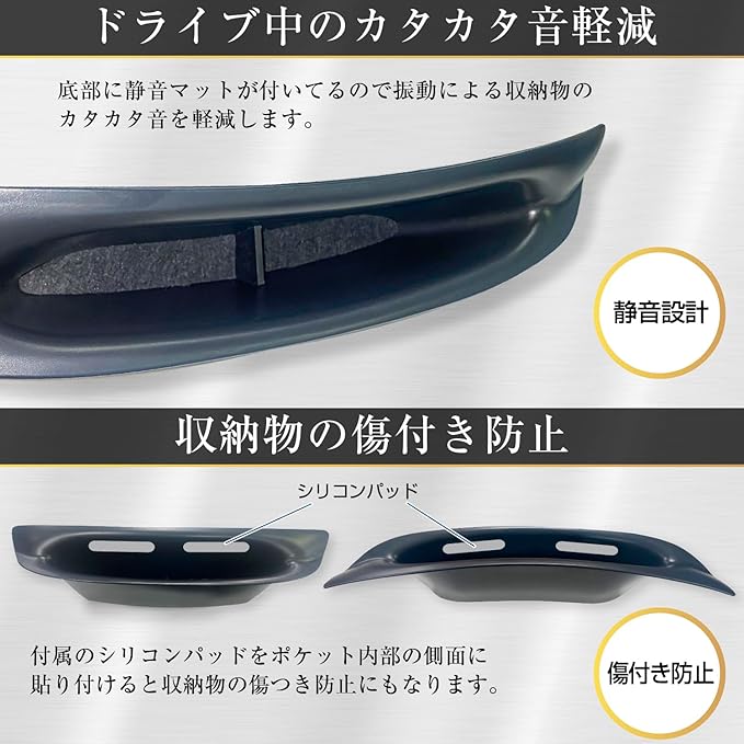 2個セットです(※左右座席共通)。付属のシリコンパッドをトレイ内部の側面に貼り付けると、収納物の傷つき防止にもなります。