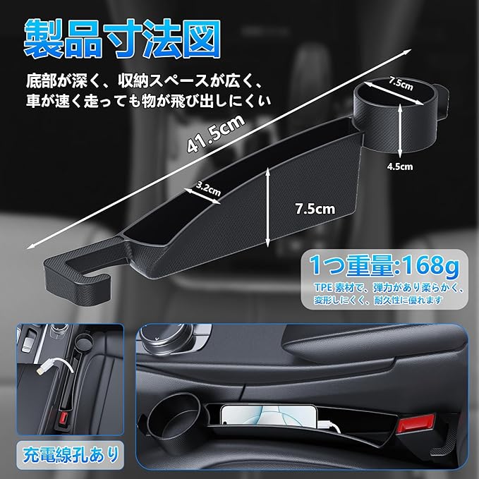 【当社の製品は、優れた特長を備えています】✅第一に、固定力に関して、2 カ所の固定ポイント(シートベルト差込口と前部カップホルダー付近)を採用しており、完全に脱落する心配はありません。✅第二に、収納機能では、最深部の深さが 7.5cm となる形状を採用しているため、車が急加速しても中身が飛び出すことがなく、さらに専用水杯架と強力フック(最大 2kg 耐荷重)を追加することで、収納の幅が格段に広がります。✅第三に、充電機能において、製品底部に充電線口を追加しています。この充電線口を通じて充電線でスマホに充電することができ、車内の充電線が散乱するのを防ぎ、車内をより整然と清潔に保つことができます。✅第四に、素材面では、環境に優しい TPE 素材を採用しており、有害物質が含まれていないだけでなく、全くニオイがないため、車内で安心して使用できます。