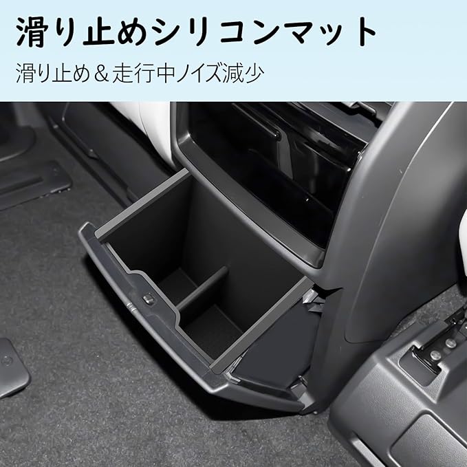 【滑り止めラバーマット付き・静音対策も万全】付属のシリコン滑り止めラバーマットは、走行中の小物のズレやガタつきを防止し、同時に衝撃音やキズを軽減。柔らかな素材で、収納物が傷つく心配もありません。汚れても取り外して水洗いできるため、清潔な状態を保つことができます。
