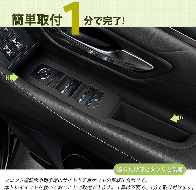 【取付簡単】工具は不要で、フロント運転席や助手席のサイドドアポケットまで本トレイマットを敷いておくことで取付できます。ブランドKasinflyが既に登録済みで、商願2024-045591です。