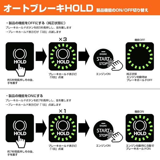 ◆取付後は、HOLDボタンを5秒押すと純正状態に変更が可能!車検時に取り外す必要がありません。純正状態に戻したあと、再びHOLDボタンを7秒押すとオートブレーキホールド機能ON。