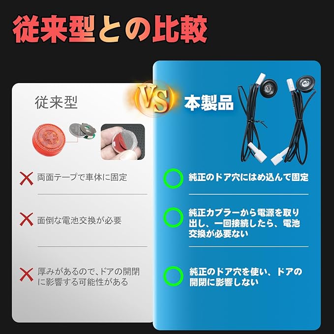 【自動点灯・消灯】車ドアを開けると、自動赤点滅になり、車ドア後方から車や自転車、バイクに警告、追突防止に役立ちます。車ドアを閉めると、自動消灯になります。