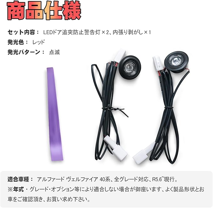 【対応車種】アルファード ヴェルファイア 40系、全グレード対応、R5.6~現行。カーテシ無し車は取付不可。セット内容:LEDドア追突防止警告灯 2、内張り剥がし 1。※取付説明書はございません。商品画像の取付手順をご参考にお取り付けください。予めご了承お願いします。※年式・グレード・オプション等により適合しない場合が御座います、よく製品形状とお車をご確認頂き、お買い求め下さい。発光色:レッド、発光パターン:点滅。