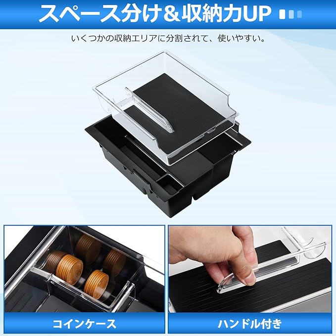 3.【3段構造化】:2つ収納トレイを追加で三段収納エリアに分割されています。また、上層部は透明素材でできて、ライトの使用を妨げない。コイン、携帯電話、カード、鍵、データケーブルなどををスッキリ収納でき、車内をキレイに!