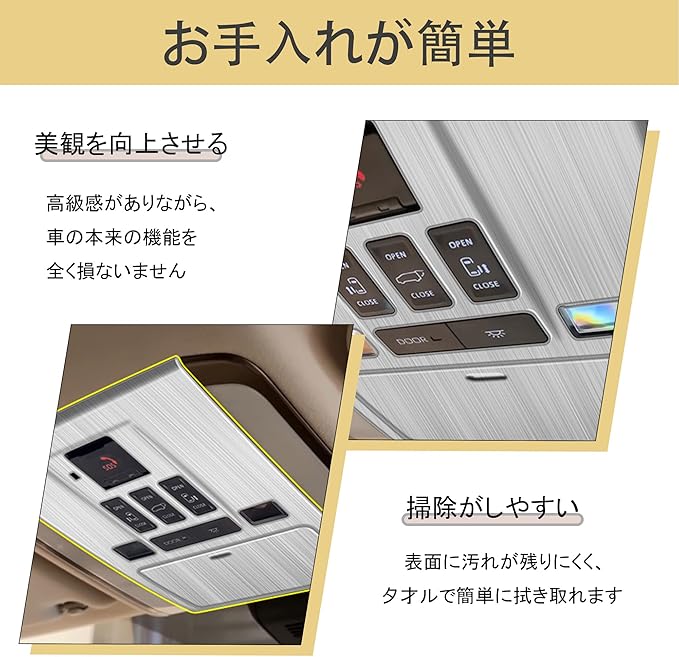 【適合車種】:この内装パネルは、アルファード/ヴェルファイア 40系の車種に完全に適合し、車内の装飾品質を向上させることができます。商品は必要な位置に簡単に取り付けることができます。 【清潔とスタイル】:車内を整理しやすくなります。のを防ぎ、キズ、汚れ、水濡れを効果的に防止し、快適な車内環境を保つことができます。同時に、スタイリッシュなデザインで車内の内装を引き立て、高級感を演出します。 【高品質ステンレス素材】 耐食性に優れた高品質ステンレス鋼を採用。錆や腐食に強く、高い耐衝撃性を兼ね備えているため、長期間にわたって形状安定性を維持します。精密加工された取り付け部分は車体に密着し、走行時の振動による緩みやガタツキが発生しません。 【簡単取付】:取り付け方法は簡単で、誰でも容易に操作できます。特別な工具は必要なく、製品を取り付け部位に接続するだけで設置が完了します。 【品質保証】当社では出荷前に厳格な検査を行っておりますので、ご安心してご購入いただけます。もし何かご質問やご不明点がございましたら、直ちに対応いたします。