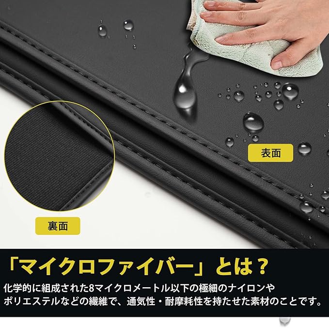 3.【高級マイクロファイバー&お手入れ簡単】車内雰囲気に溶け込みやすいブラック、気品に満ちた車内空間に違和感なく装着できます。後部座席のお子さまがシートを蹴って付ける汚れや傷なども心配することなく、雑巾で簡単に拭き取ります。また、耐摩耗性および耐久性に優れる高級マイクロファイバーを採用し、厚み1.8㎜の高密度でクッション性が高く、車体に優しいです。