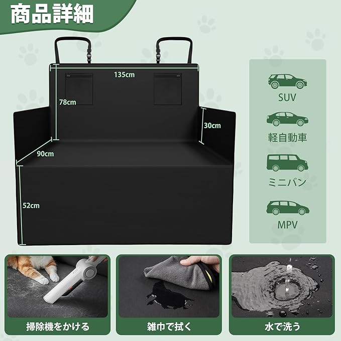 3.【汚れ・摩耗性・耐傷性】:高品質のオックスフォード素材を使用しており、耐摩耗性・耐傷性に優れています。さらに、左右の縦幅を広く設計しているため、雨や雪の日でも、ペットとのドライブ時でも、車内をしっかりと保護します。汚れた場合でも、濡れた雑巾で拭くか、取り外して水洗いするだけで簡単に清潔になります。