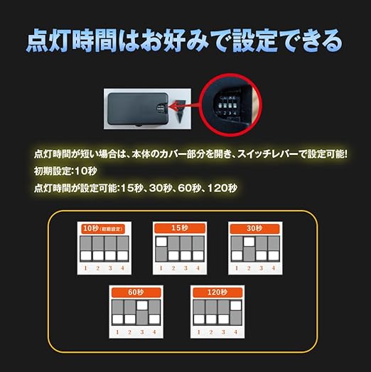 点灯時間は自分好みで設定できます。(10秒 15秒 30秒 60秒 120秒)