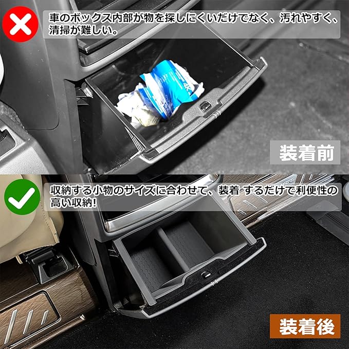 【簡単に取付】:アルファード/ヴェルファイア 40系車種専用の設計で、ツールは一切必要なし、ボックスを車内にはめるだけで装着完成します。工具不要で脱着も簡単です。機能性だけでなくデザイン性にも優れており、車内のカスタマイズを考えている方には特におすすめです。セット内容:ABS製リアマルチボックス本体*1、ゴム製リアマルチボックス本体*1
