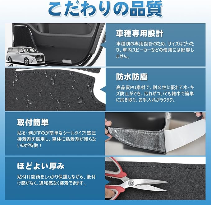 【適合車種】アルファード ヴェルファイア 40系 2023年~現行。※ガソリン ハイブリッド車対応、セット内容:キックガード2枚セット、設置場所:フロントドア。色:ブラック。