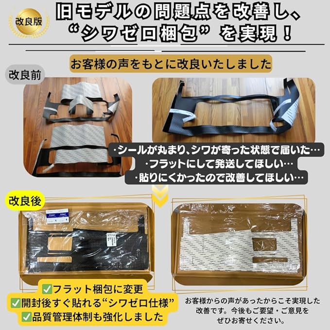 【梱包時の折れクセやシワについて】本製品は柔軟性の高い保護シート素材を採用しています。開封直後や仮置きの段階で折れクセやシワが見えても、貼り付け時に面全体を圧着すると素材が面に追従し、仕上がりにシワは残りません。中央から外側へ空気を押し出すようにゆっくり圧着していただくと、よりフラットに密着します。