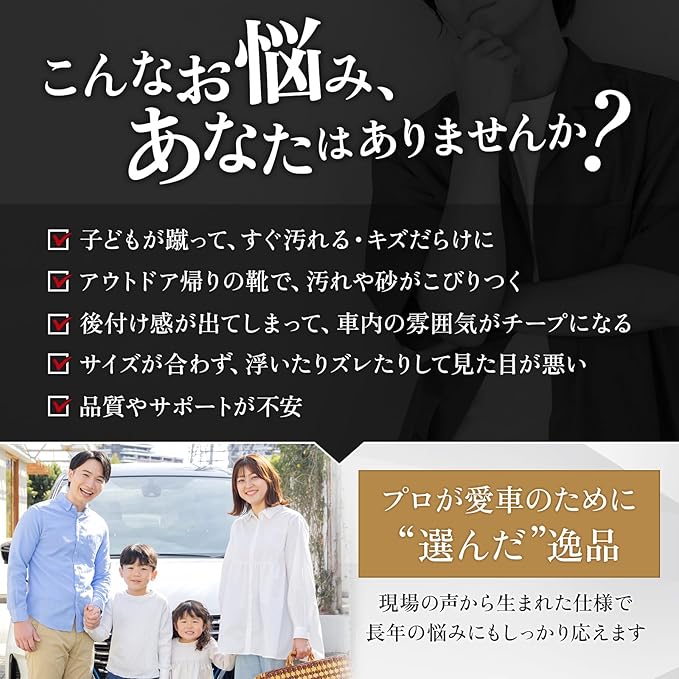 【汚れやキズからしっかり保護】アウトドア後の泥汚れや子どもの足元のバタつきから、シート裏面を守る頼れるアイテム。プロ目線で選ばれた厚手素材は耐久性があり、汚れてもサッと拭くだけで手入れも簡単。砂やホコリも残りにくく、日々の掃除の手間を減らします。長くきれいに使いたい方にぴったりです。