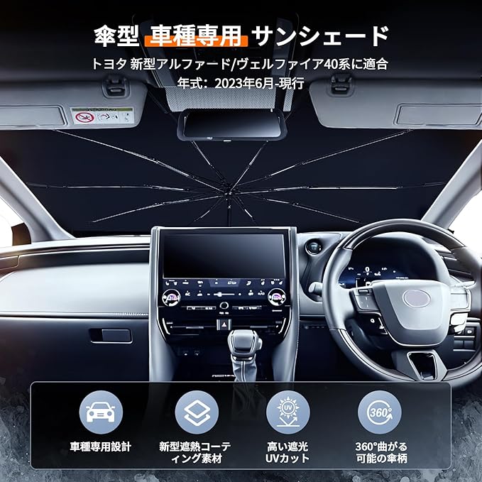 新型 アルファード ヴェルファイア 40系 傘型 フロントガラス サンシェード 遮光 断熱 ALPHARD VELLFIRE 40系 車種専用設計 傘式 車用サンシェード UVカット 紫外線対策 パラソル 10本骨 360 回転可能 プライバシー保護 ワンタッチ収納 車中泊 取付簡単 コンパクト 内装パーツ