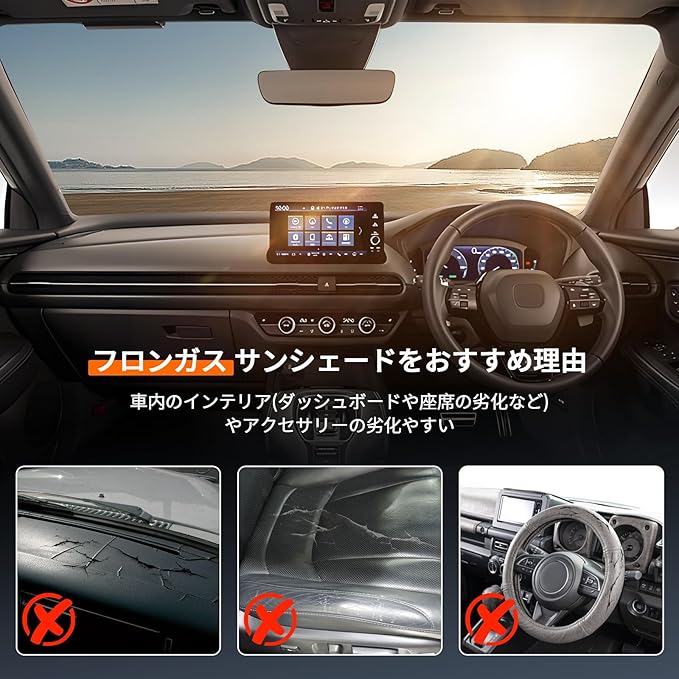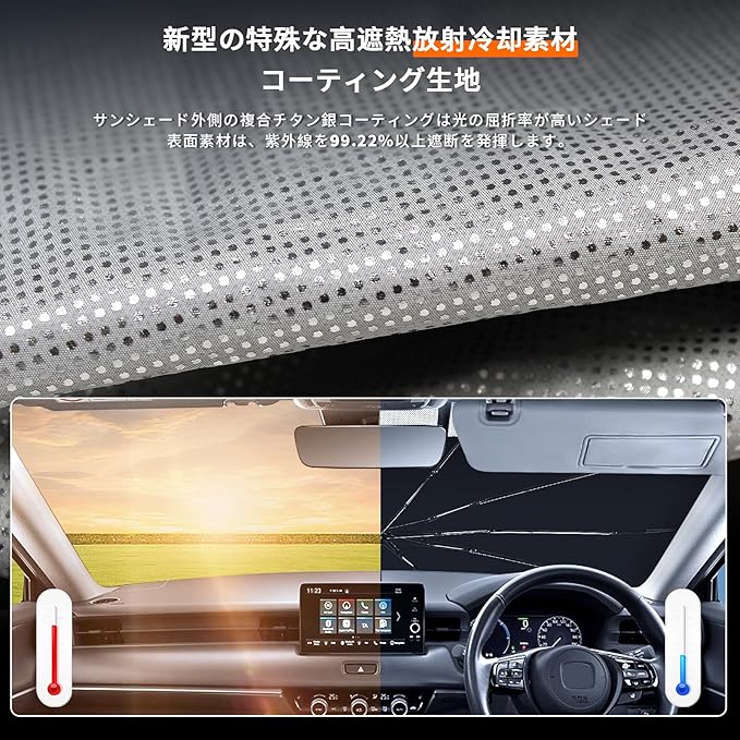 【猛暑対策・内装保護】この製品は太陽光を通さない高密度の生地を使用して紫外線を99.22%以上カットします。駐車中の車内を涼しく保ち、暑さを防げます。長時間の日焼けによる、内装劣化・色あせ・ひび割れなどを防ぐことができます。